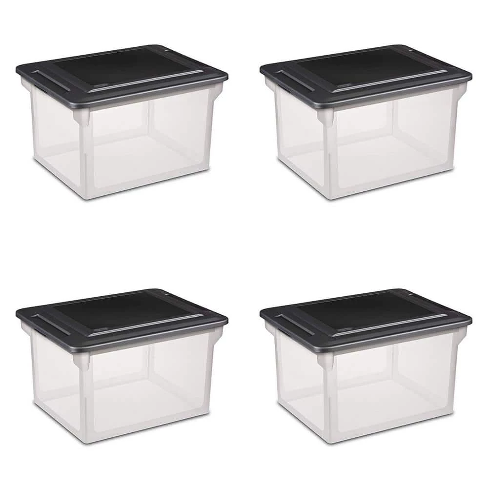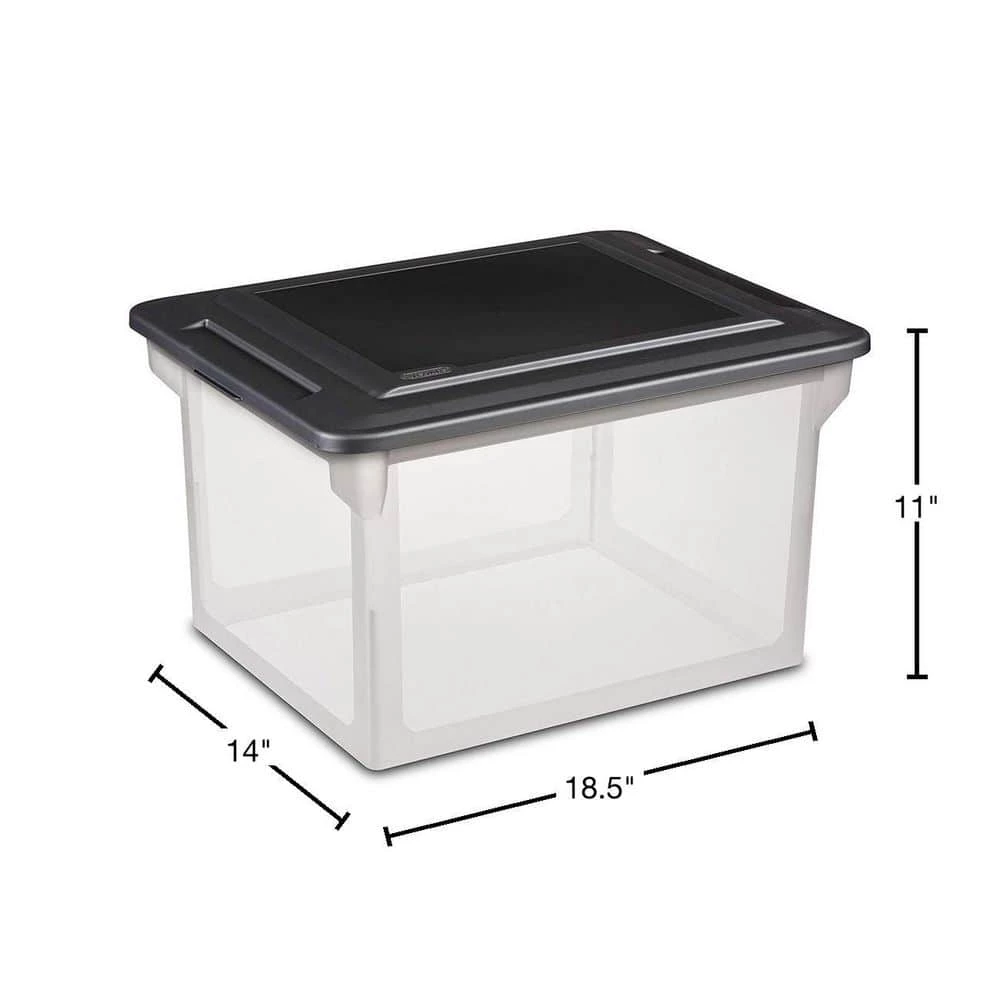 It’s hard to be productive while surrounded by clutter. Keep your office and workspace neat and organized with the 4-pack Sterilite Convenient Versatile Clear Organizing Storage File Box with Lid. The overall dimensions of this item are 18.5 in. W, 14 in. W and 11 in. tall, making it an ideal solution for keeping receipts, bills, taxes and paperwork sorted and contained. Customize letter or legal-sized hanging folders and file away neatly organized, while reducing clutter around the home or office. The tight fit snap black lid keeps files dust-free and protected, while the indexed top allows for multiple storage containers to be stacked, maximizing vertical storage space. The organizer’s contoured design provides a comfortable grip surface for easy transporting when files need to be taken on the go or relocated. Create a productive environment with the help of 4-pack Sterilite Convenient Versatile Clear Organizing Storage File Box with Lid.