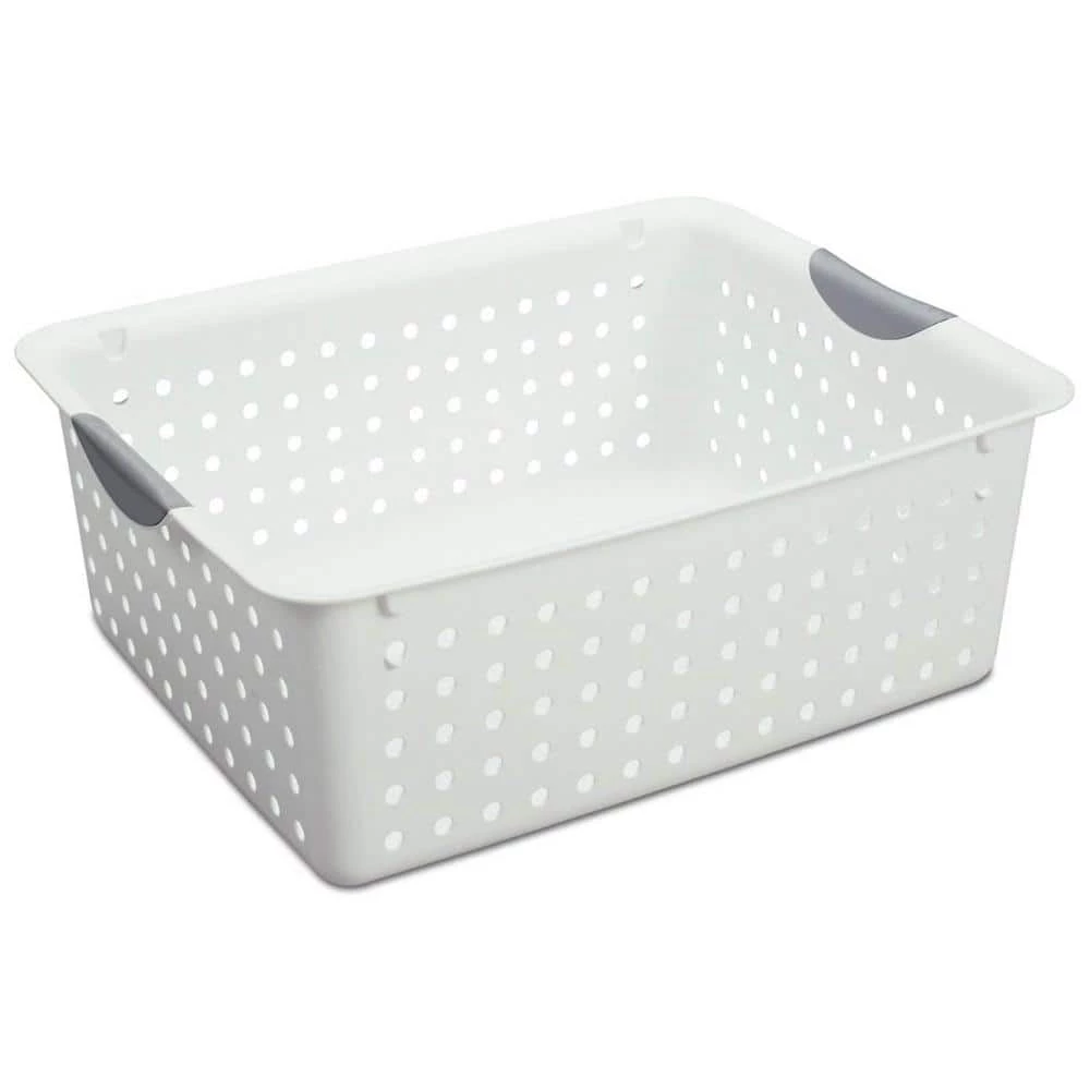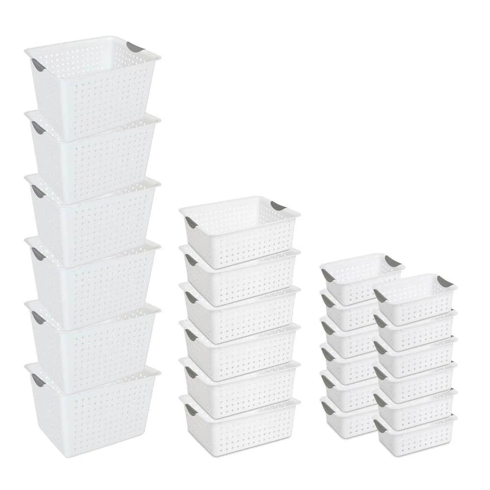 “The Sterilite Deep Ultra Basket is ideal for organizing countertops, kitchen cabinets, pantries and shelving around the home. Store vegetables in a pantry, supplies in a bathroom or organize cleaning supplies under the sink. The contoured handles allow for comfortable transporting, and the smooth finish is easy to clean. Item is ideal for storing CD’s, DVD’s, laundry, or office supplies too. The Sterilite Deep Ultra Basket is ideal for the garage, crafts, toys, games, even fresh pantry items too. Really most anywhere a person needs to control some clutter. This bundle also includes 6 large baskets and 12 small baskets.”