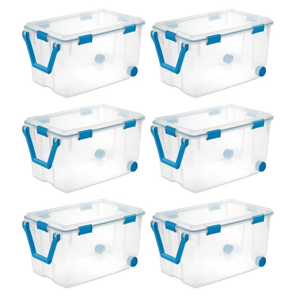 Need help getting organized. The Sterilite 120 qt. Clear Plastic Home Storage Box with Latching Lid, 6-Pack will help you with your moving or storage needs. These durable storage totes feature a 120-quart capacity and are an ideal solution for keepsakes, photographs, important documents, linens, clothing, and other items that need to be stored away and protected. The latching lids attach to the base to ensure your belongings stay safe and secure during a move or while in storage, even in uninsulated storage spaces. The gasket seals both air and moisture, keeping those special belongings safe from the elements, dust, and pests. Durable, tight-fitting latches keep the lids secured to the base, and the clear lid and base allow contents to be easily identified without opening the lid, saving you from searching through multiple boxes for the item you’re looking for. Quality is key when it comes to choosing storage materials. That’s why the 6-Pack of 120 qt. Clear Plastic Home Storage Box with Latching Lid from Sterilite is crafted from durable plastic to keep your possessions protected.