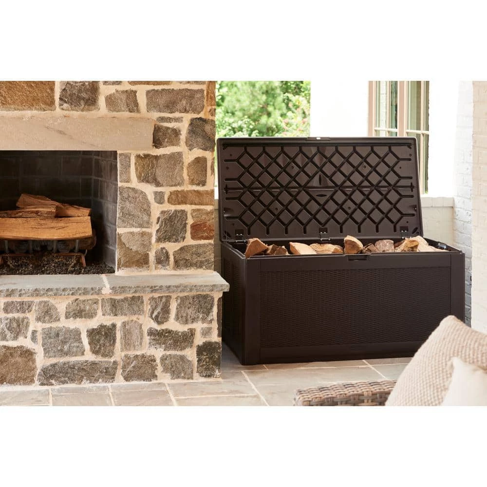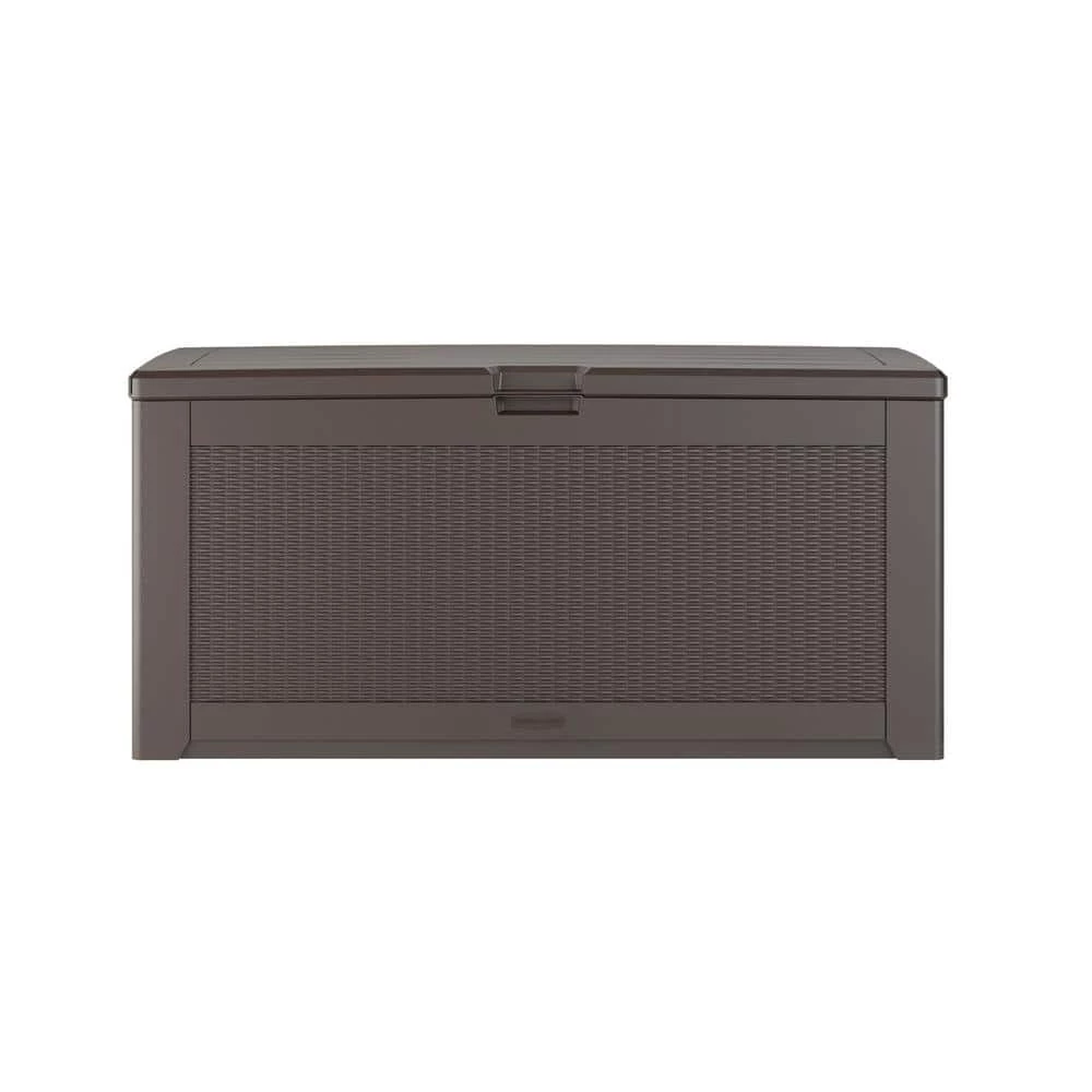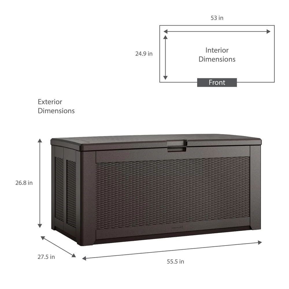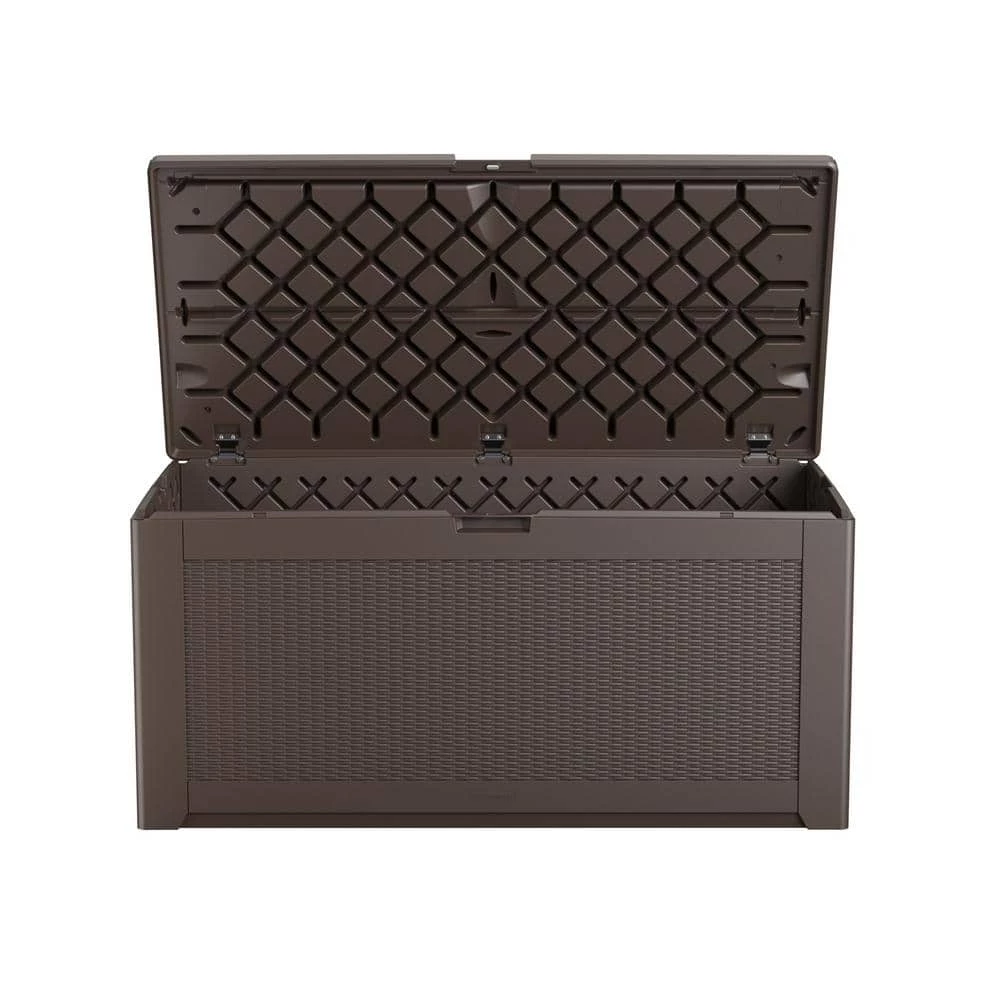 Rubbermaid’s XL Deck Box features a basket weave pattern to complement decor. This deck box has 67% fewer parts and is much faster and easier to assemble then previous Rubbermaid XL Model. Safely store a variety of outdoor supplies including large patio cushions, patio umbrellas, charcoal, firewood, gardening equipment and more. This deck box is made out of heavy-duty resin that will not rust, rot, fade or warp.