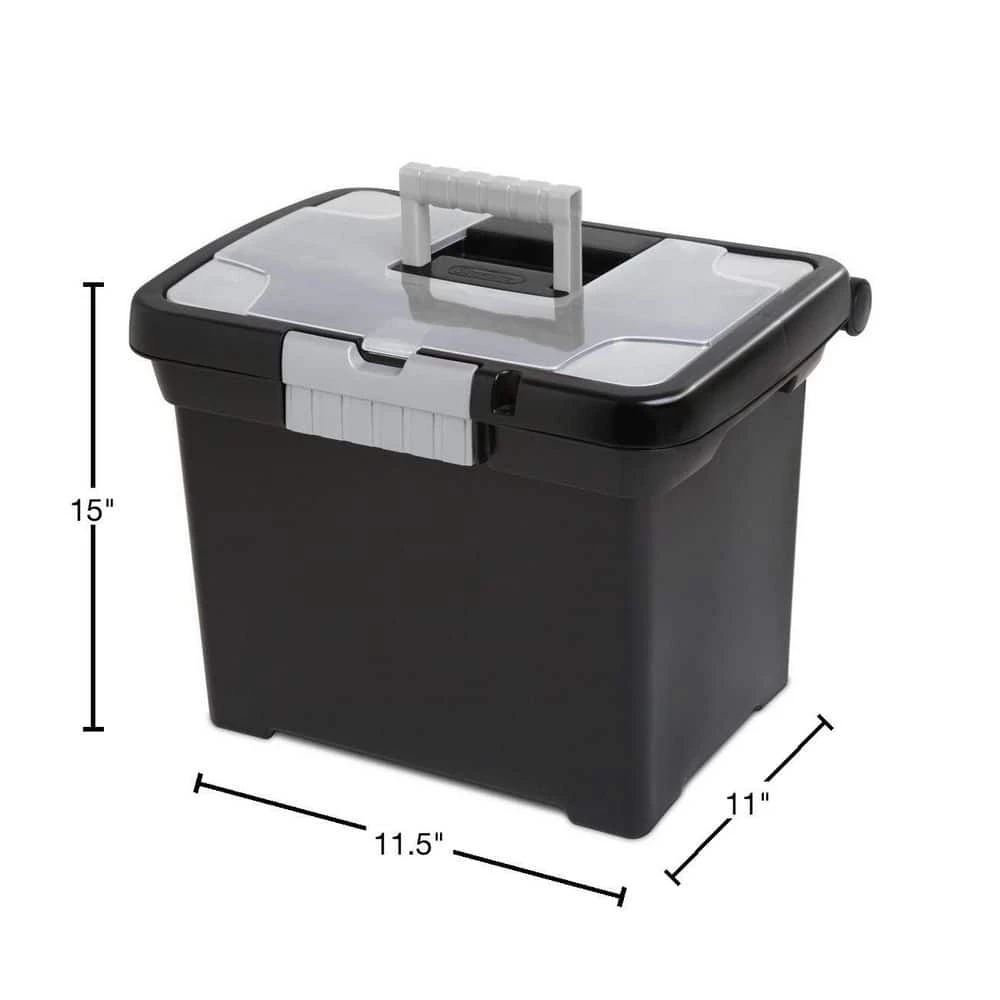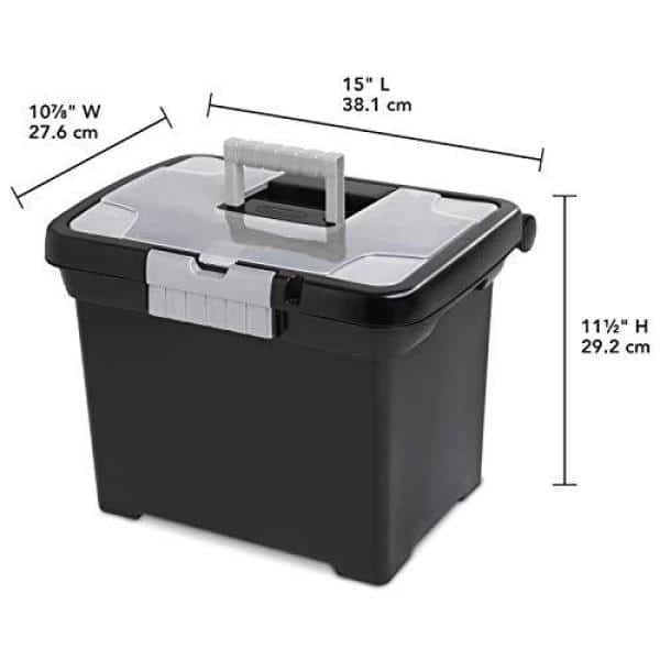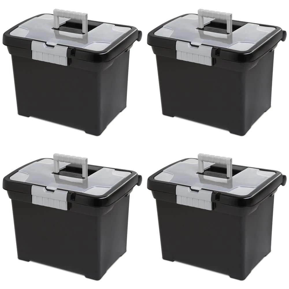 This 4-pack of Sterlite Portable File Boxes includes 4-storage boxes that help you organize your documents or transport file folders effectively. The file box has a large capacity and fits letter-sized hanging files, making it perfect for keeping important documents safe. It can be locked shut with a small padlock. The clear lid makes it easy to check in its contents without showing everyone what’s inside. The lid locks into place with the titanium gray latches, keeping everything sealed inside. The lid also has a handle on top, so it’s easy and convenient to carry to your meeting or new storage location. Keep your documents safe in the Sterlite Portable File Box.