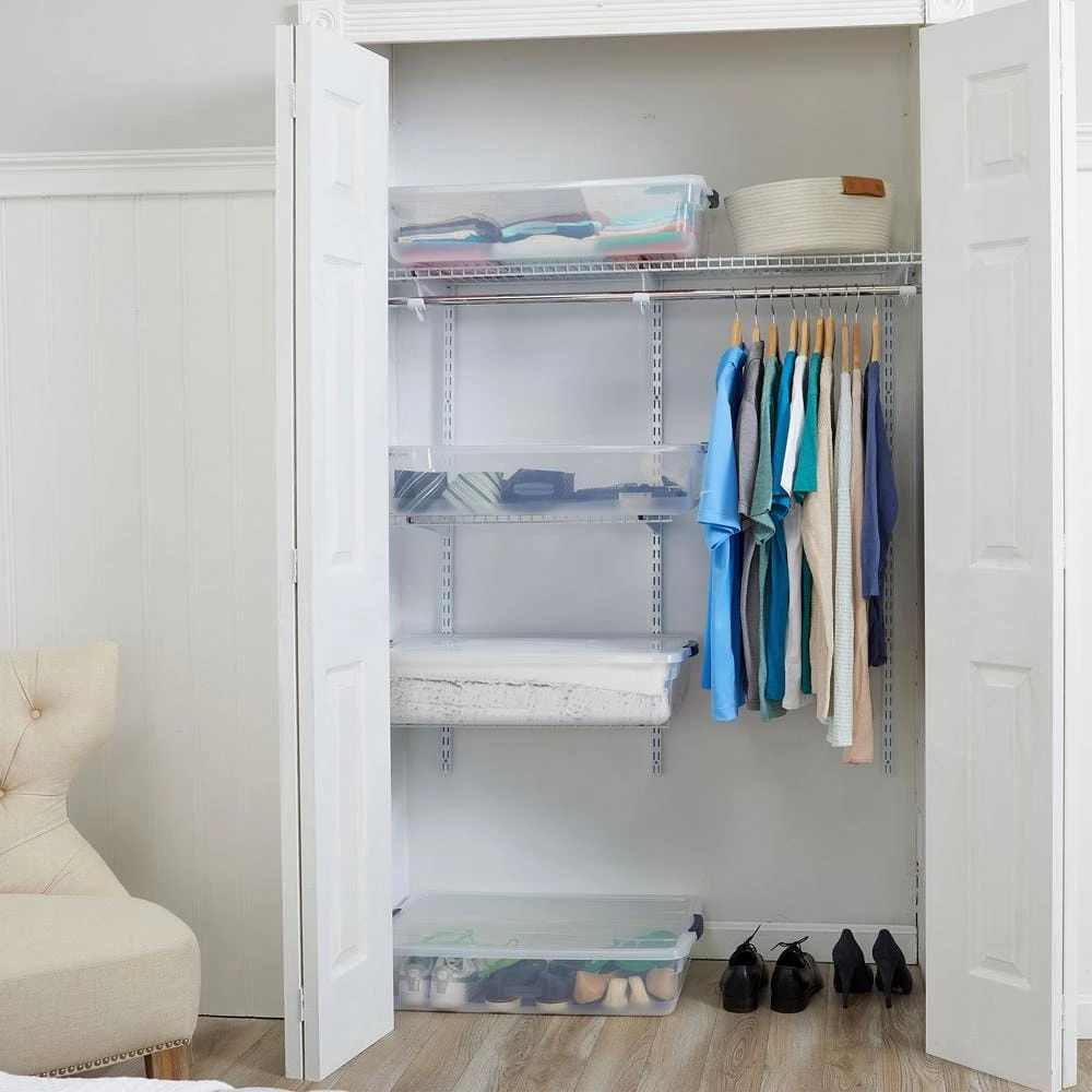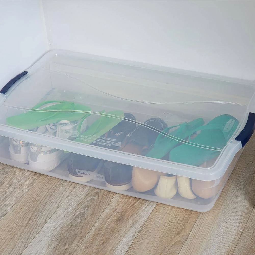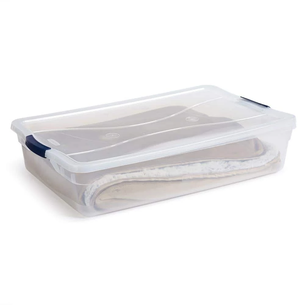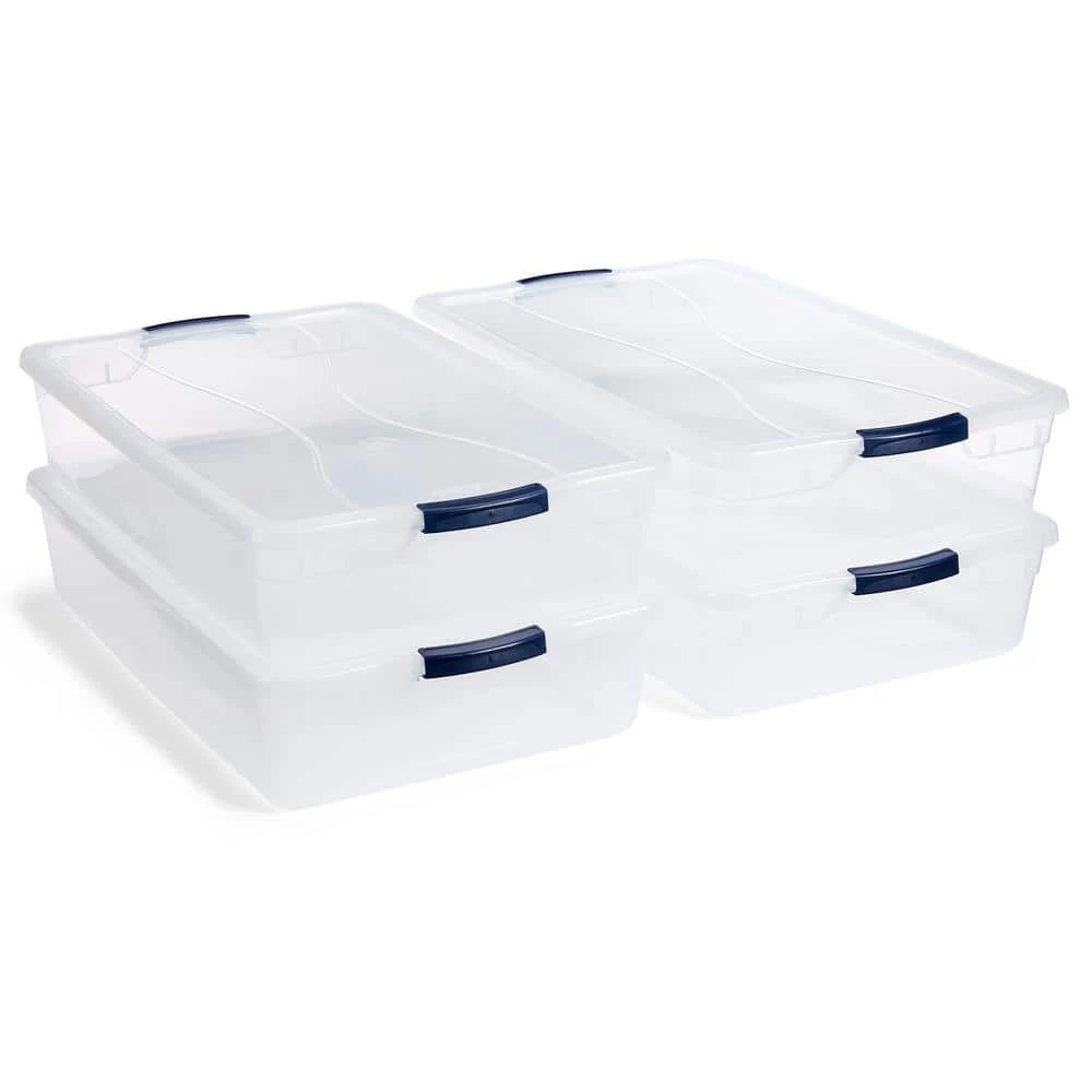 When clutter threatens to take over your space, reign it in with help from the 4-pack of Rubbermaid Clever store 41 Qt. Plastic Storage Containers. This clear storage bin makes it easy to organize your things and see exactly where they are. This storage box overall measures 29 in. long and 18 in. wide. With a 41 Qt. capacity and a shallow 6 in. height, this storage container is great for storing small items. Papers, art supplies, kitchen spices, hats and gloves, toys, office supplies, and more will fit inside the latching tote. You can conveniently see what you stored in the bin thanks to the clear sides and see-through lid. This plastic storage container’s lid makes for both easy transport and convenient storage. By simply snapping the latching lid into place, your valuable items stay safe inside the storage tote. The recessed design of the heavy-duty lid allows for effortlessly stacking storage bins in your closet, garage, or storeroom. This will help keep your space looking neat and tidy. Keep your items organized. With the 4-pack of Rubbermaid Cleverstore 41 Qt. Plastic Storage Containers, there is a place for everything.