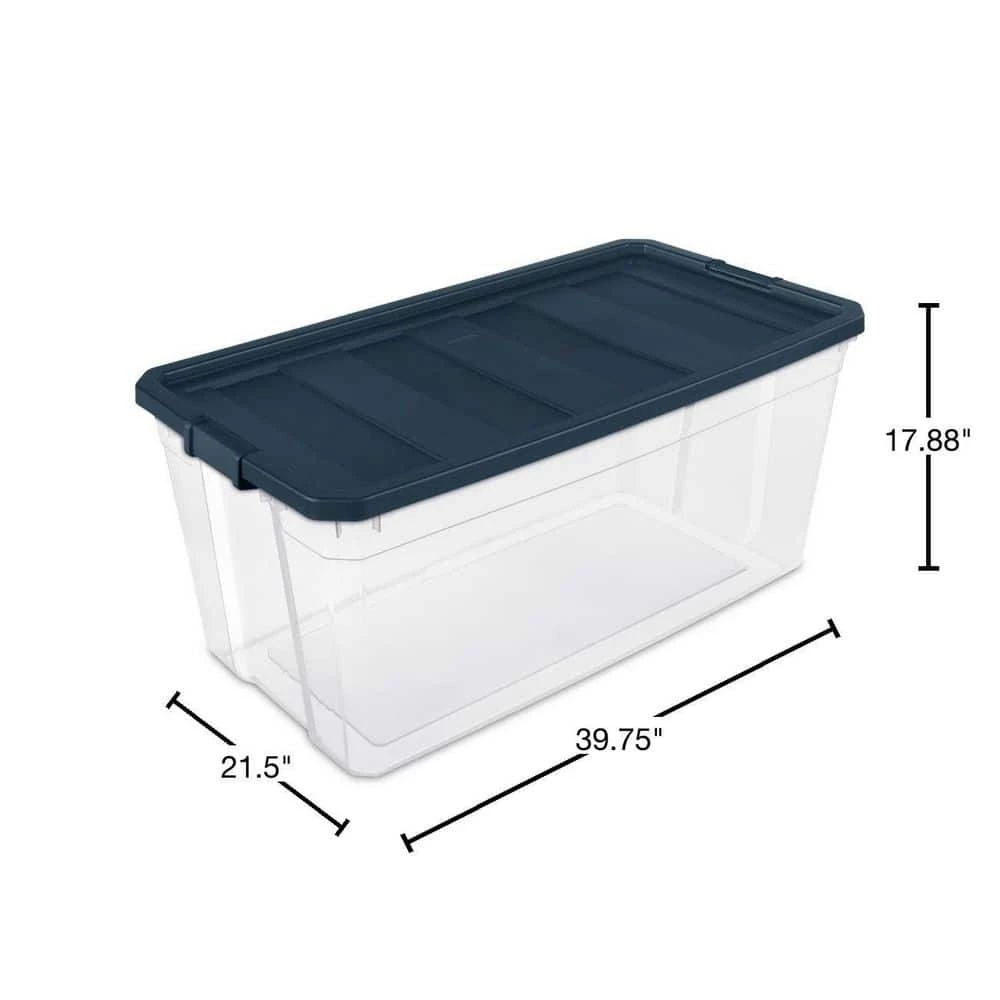 In need of a durable storage system for closets, basements, garages, or attics The Sterilite Modular Stacker line features rugged construction for added peace of mind that contents will stay safely stored inside. The 50 Gal. Stacker Box is the perfect size for camping gear, sports equipment, seasonal decorations, and other bulky items, and the clear base allows quick viewing of contents. The robust latches offer extra security that the lid will stay attached to the base, and the textured surface makes for a sure grip when carrying. The deep recessed lids provide stability when stacking for efficient use of storage space. Mix and Match the complementary Clear and Opaque storage containers, store both items that need to be viewed quickly as well as those items that can be hidden away, in the same storage system. The 50 Gal Stacker Box shares the same lid as the 50 Gal. Stacker Tote allowing secure stacking and the clear and opaque versions to be stacked interchangeably. The overall assembled dimensions for this item are 39-3/4 in. x 21-1/2 in. x 17-7/8 in.