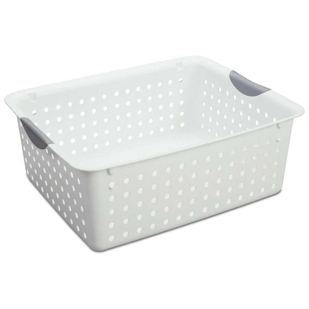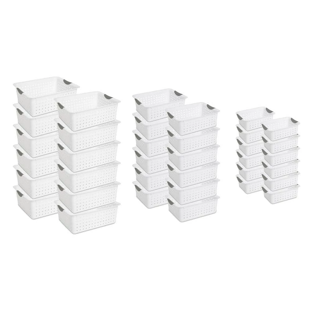 The Large Ultra Basket is ideal for organizing countertops, kitchen cabinets, pantries and shelving around the home. Store vegetables in a pantry, supplies in a bathroom, or organize cleaning supplies under the sink. The contoured handles allow for comfortable transport, and the smooth finish is easy to clean. This bin is ideal for storing CDs, DVDs, laundry, or office supplies too. The Sterilite Large Ultra Basket is ideal for the garage, crafts, toys, games, and fresh pantry items too. This large ultra-basket is ideal for a wide variety of uses. The Ultra basket is also durable with its titanium insert handles. This package also includes 12 medium baskets and 12 small baskets.