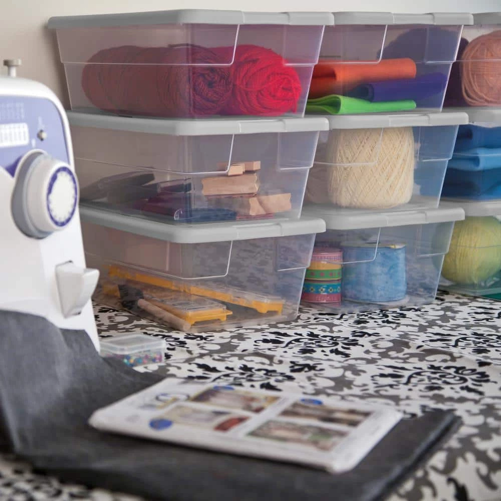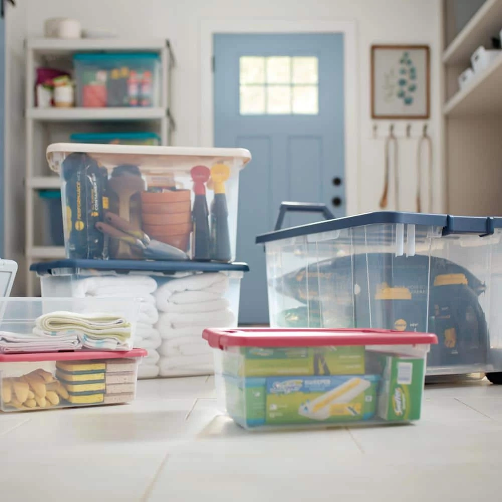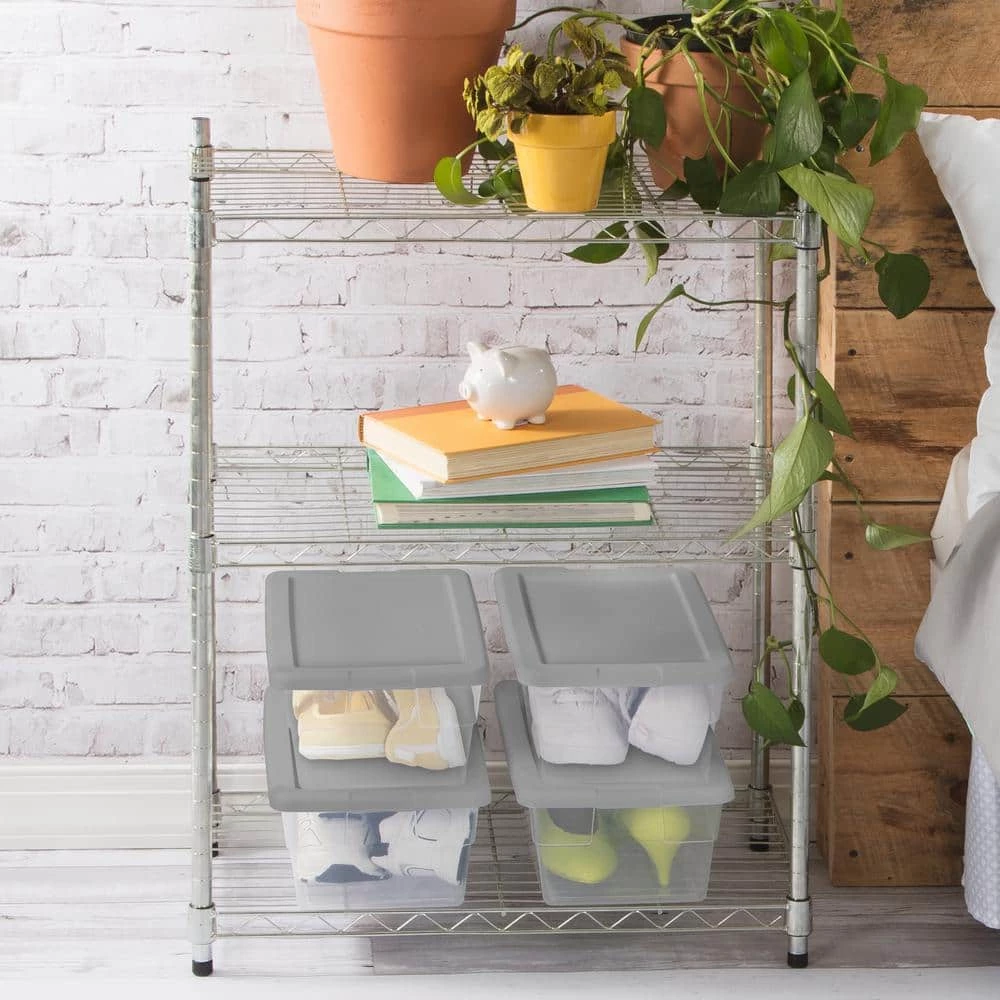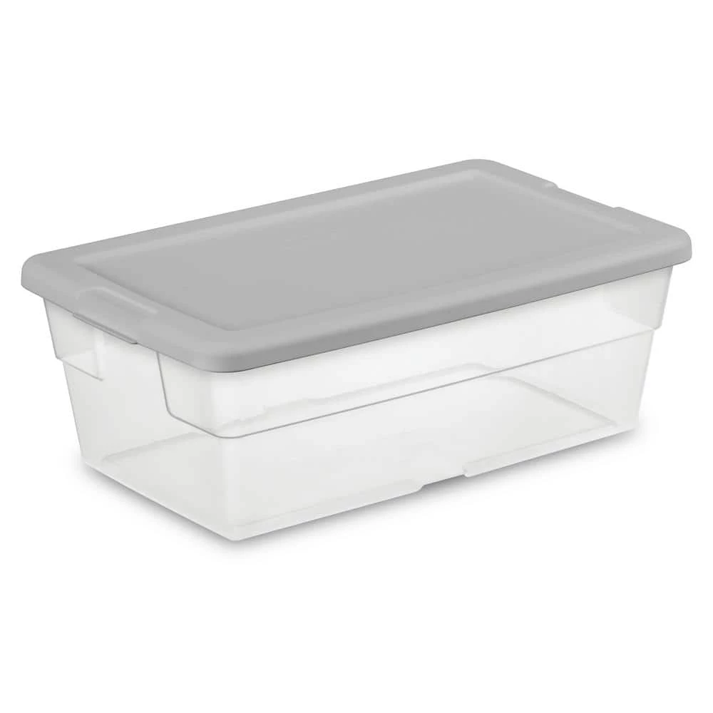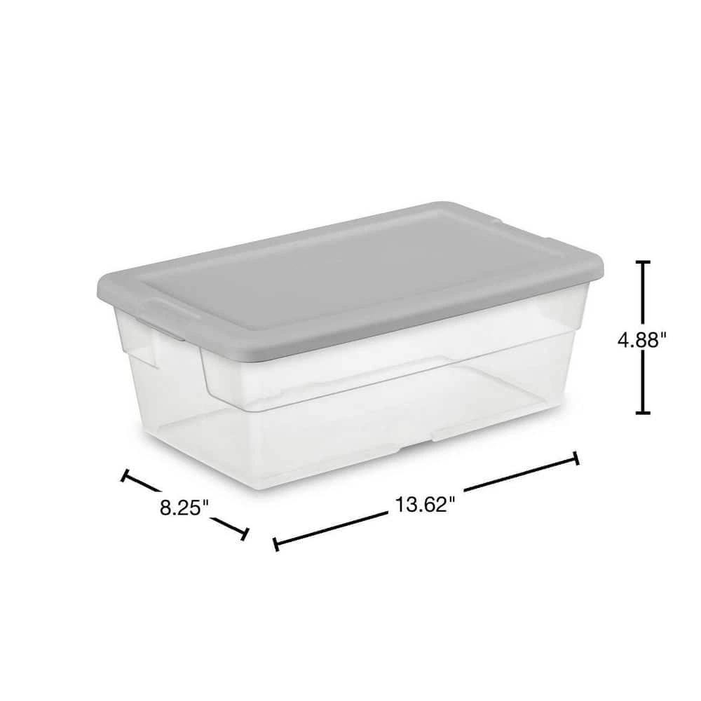 Get organized with the Sterilite Clear Storage Box line The Sterilite 6 Qt. Storage Box is ideal for a variety of basic household storage needs, helping to keep your living spaces neat. The clear base allows contents to be easily identified at a glance, while the opaque lid snaps firmly onto the base to keep contents contained and secure. Stack same size containers on top of each other for efficient use of vertical storage space. This storage box is ideal for sorting and storing shoes, accessories, crafts and other small items around the home and fits conveniently on 16 wire closet shelving, bringing order to closets. The overall assembled dimensions for this item are 13-5/8 in. x 8-1/4 in. x 4-7/8 in.