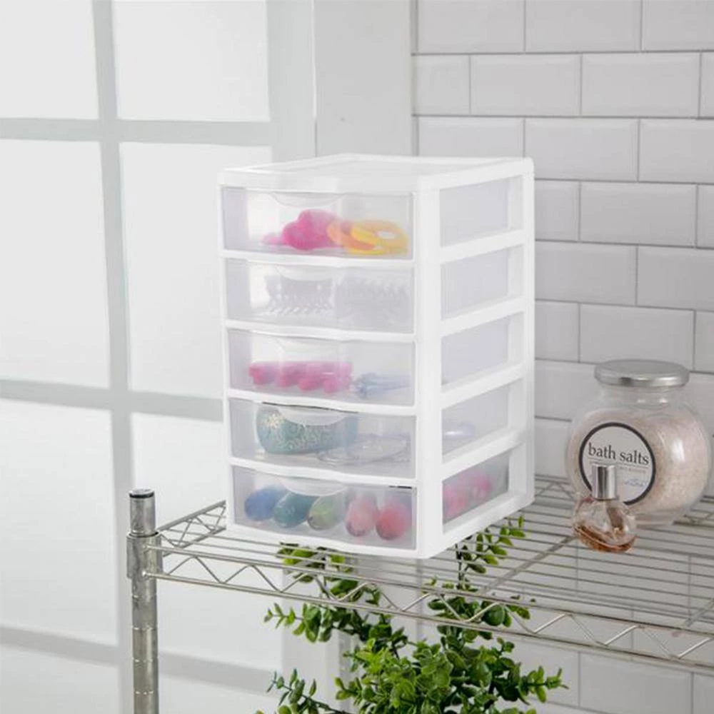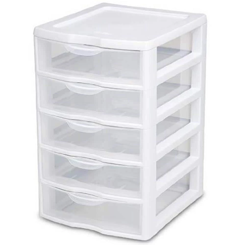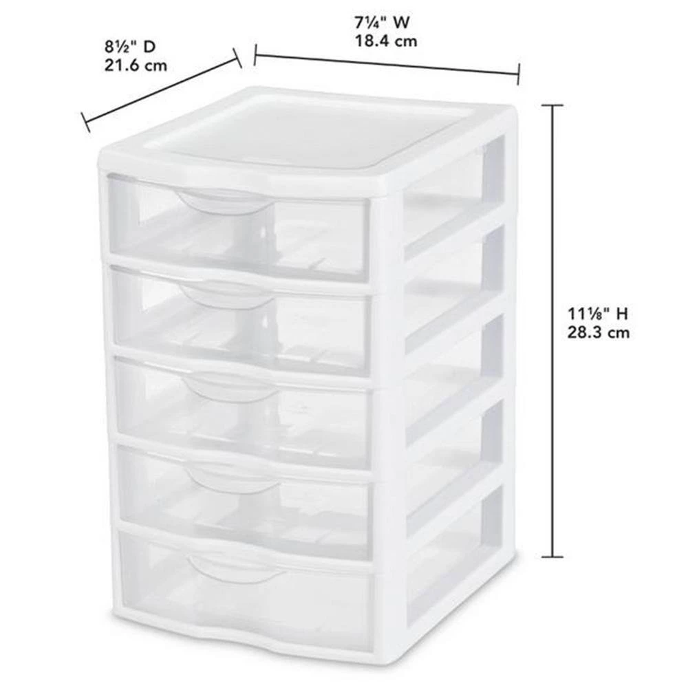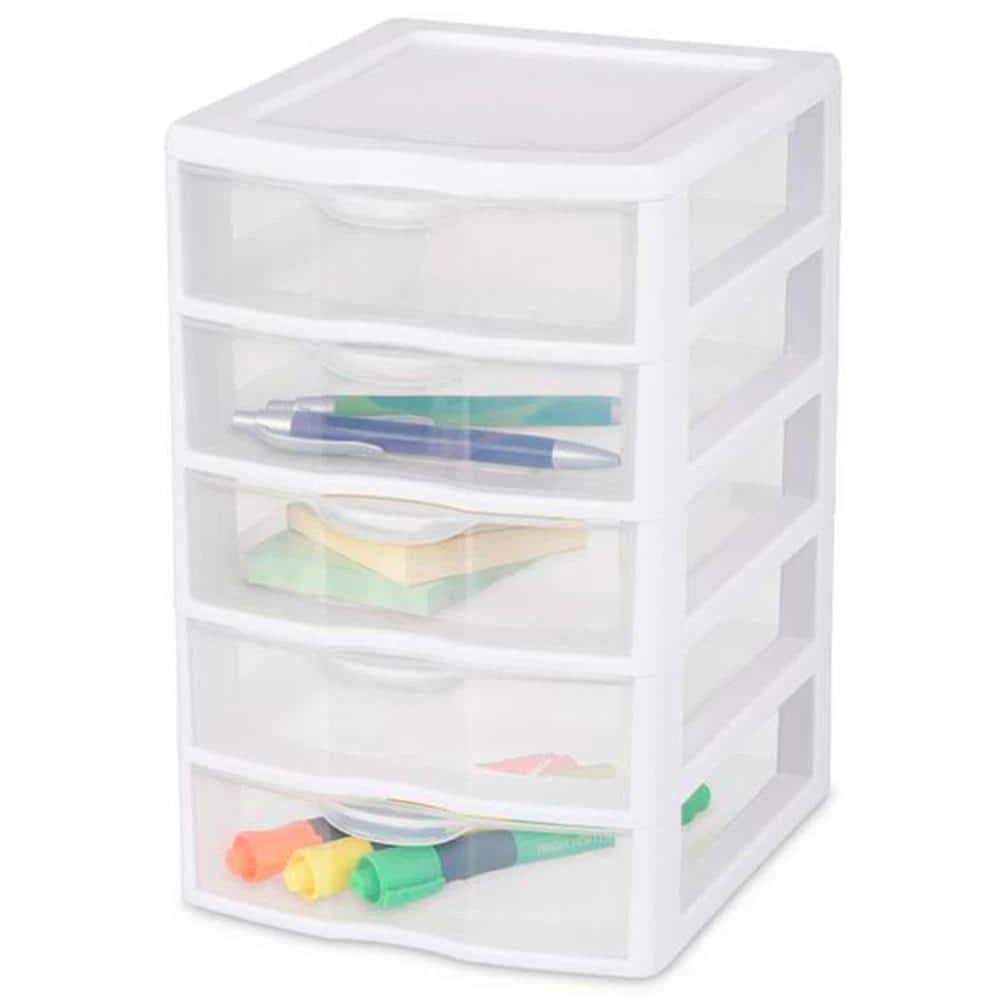 Create a simple system of organization in your home with the Sterilite 5-Drawer Desk Storage Bin, 4 Pack & 3-Drawer Desk Storage Bin, 4 Pack. This set of 8 drawers helps control everyday clutter keeping desks, countertops, and shelves organized with easy-slide drawers that are perfect for storing accessories, supplies, or seasonal decor. These multi-purpose units can be used in any room for crafts, office supplies, jewelry, first aid, beauty items, and more. With both 3-drawer and 5-drawer units included, you’ll love the varying options and configurations this set provides. Ideal for keeping items sorted for easy access where they are used most often, the classic bins complement any decor. Multiple units stack on top of each other to create a customized storage solution. The overall dimensions of the 3-drawer unit are 8.50 x 7.25 x 6.87 inches, and the dimensions of the 5-drawer unit are 8.50 x 7.25 x 11.12 inches. Keep your smaller items like pens, highlighters, notebooks, and more close at hand while you’re studying or working. Enjoy a more organized space on your work desk with the 5-Drawer Desk Storage Bin, 4 Pack & 3-Drawer Desk Storage Bin, 4 Pack from Sterilite.