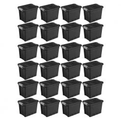 Organize your closet, office, craft supplies, or kid’s playroom, putting everything in its proper place with the 24-pack of the Sterilite 7.5 gal. Rugged Industrial Storage Totes and Clip Lids. The channeled walls of these storage totes provide added strength and help to resist crushing under heavier loads. The contoured end panels create integrated handles for comfortable lifting. Robust latches securely attach the lid to the base while the textured finish provides a non-slip grip. The tight-fit drip-resisting lids provide maximum protection against items getting wet. Deep recessed lids allow for secure stacking to maximize available storage space. The design of the lids as well as the keyhole slots provides options for tie-downs to keep totes in place when transporting and storing. These durable storage totes are ideal for storing boots, accessories, tools, and supplies in your home, attic, basement, or garage. Enjoy the peace full organization can bring to our home with the 24-pack of the 7.5 gal. Rugged Industrial Storage Totes and Clip Lids from Sterilite.
