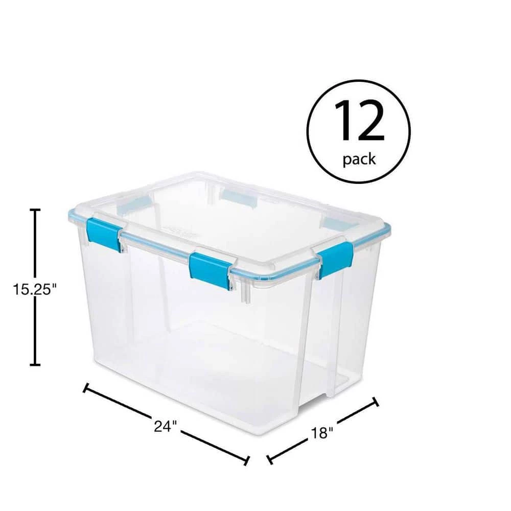 This pack of Sterilite 80 Qt. Gasket Boxes includes 12 clear, plastic storage containers that are great for organizing paperwork, school projects, photographs, or even clothing in your home or office. This storage box has gasket seals lining the lid that keep your items secure. The seals are resistant to air and moisture and keep pet food and bulk foods fresher for longer periods of time. The clear plastic base and lid make it easy for you to see the contents so you don’t have to dig around to find what you need. The handles are comfortable and optimal for transportation. Store your items safely and protect them from air and moisture in these Sterilite 80 Qt. Gasket Boxes.