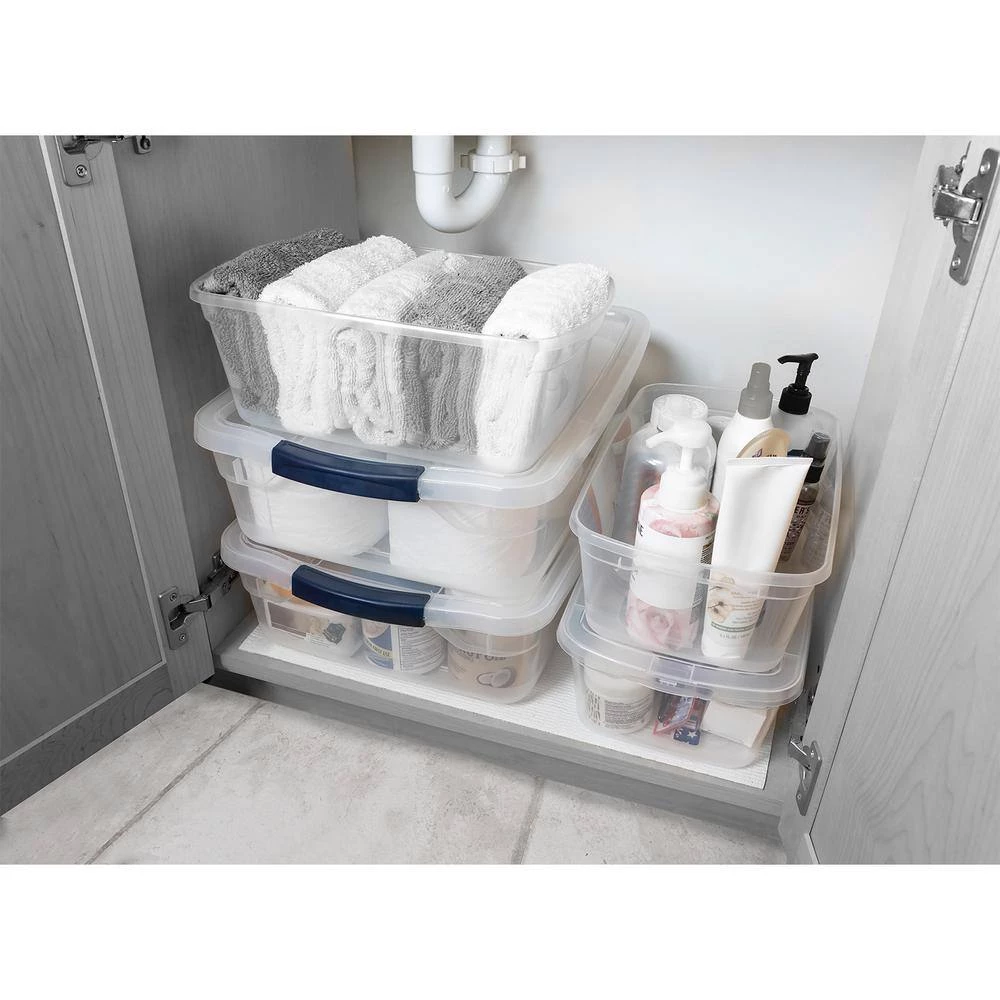 When clutter threatens to take over your space, reign it in with help from these (12) Rubbermaid Cleverstore 16 qt. Plastic Storage Containers. These clear storage bins make it easy to organize your things and see exactly where they are. With 16-quart capacities, these clear storage containers are great for storing small items like art supplies, kitchen spices, hats and gloves, toys, office supplies, gardening tools, shoes, and more. You can easily see what you stored inside the bins thanks to their clear sides and lids. These transparent plastic storage containers each come with a lid for easy transport and convenient storage. Just snap the lid into place and your items stay safe inside the storage tote. The lid is recessed so you can easily stack storage bins in your closet, garage, or store room. Keep your items organized with these Rubbermaid Cleverstore 16 qt. Plastic Storage Containers.