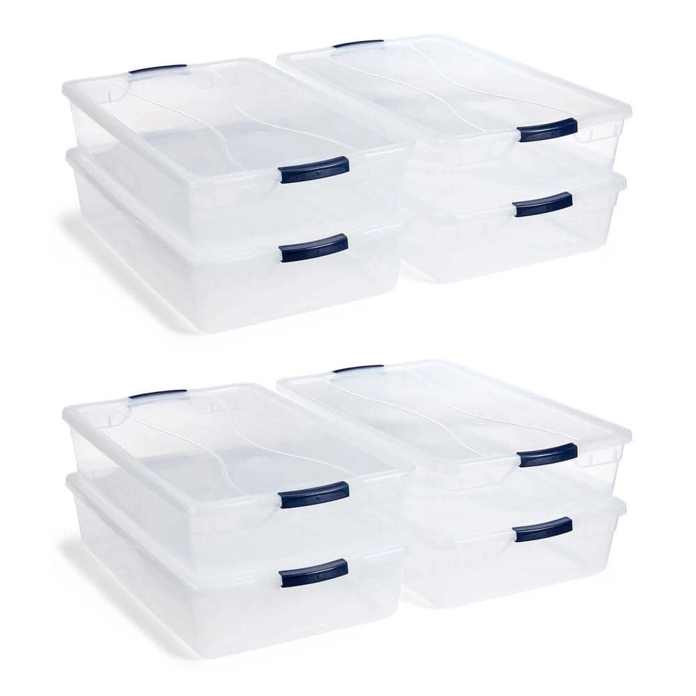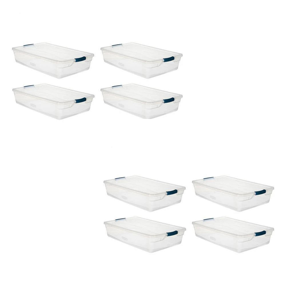 When clutter threatens to take over your space, reign it in with help from the 8-pack of Rubbermaid Cleverstore 41 qt. Plastic Storage Containers. This clear storage bin makes it easy to organize your things and see exactly where they are. This storage box overall measures 29 in. long and 18 in. wide. With a 41 qt. capacity and a shallow 6 in. H, this storage container is great for storing small items. Papers, art supplies, kitchen spices, hats and gloves, toys, office supplies, and more will fit inside the latching tote. You can conveniently see what you stored in the bin thanks to the clear sides and see-through lid. This plastic storage container’s lid makes for both easy transport and convenient storage. By simply snapping the latching lid into place, your valuable items stay safe inside the storage tote. The recessed design of the heavy-duty lid allows for effortlessly stacking storage bins in your closet, garage, or storeroom. This will help keep your space looking neat and tidy. Keep your items organized. With the 8-pack of Rubbermaid Cleverstore 41 qt. Plastic Storage Containers, there’s a place for everything.