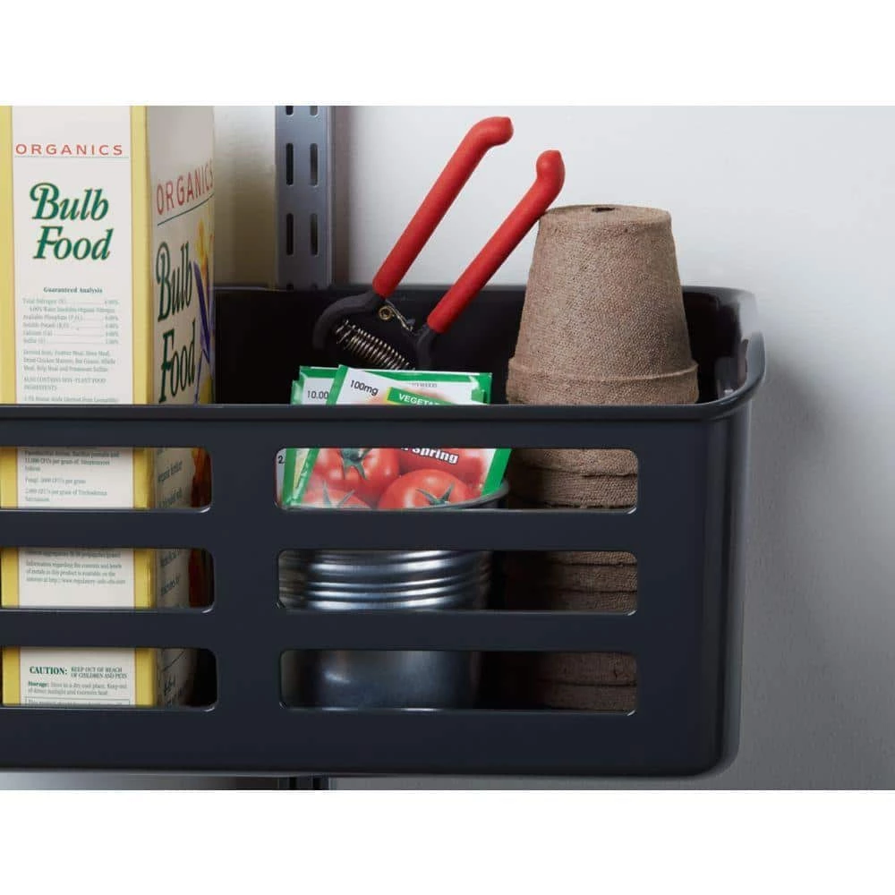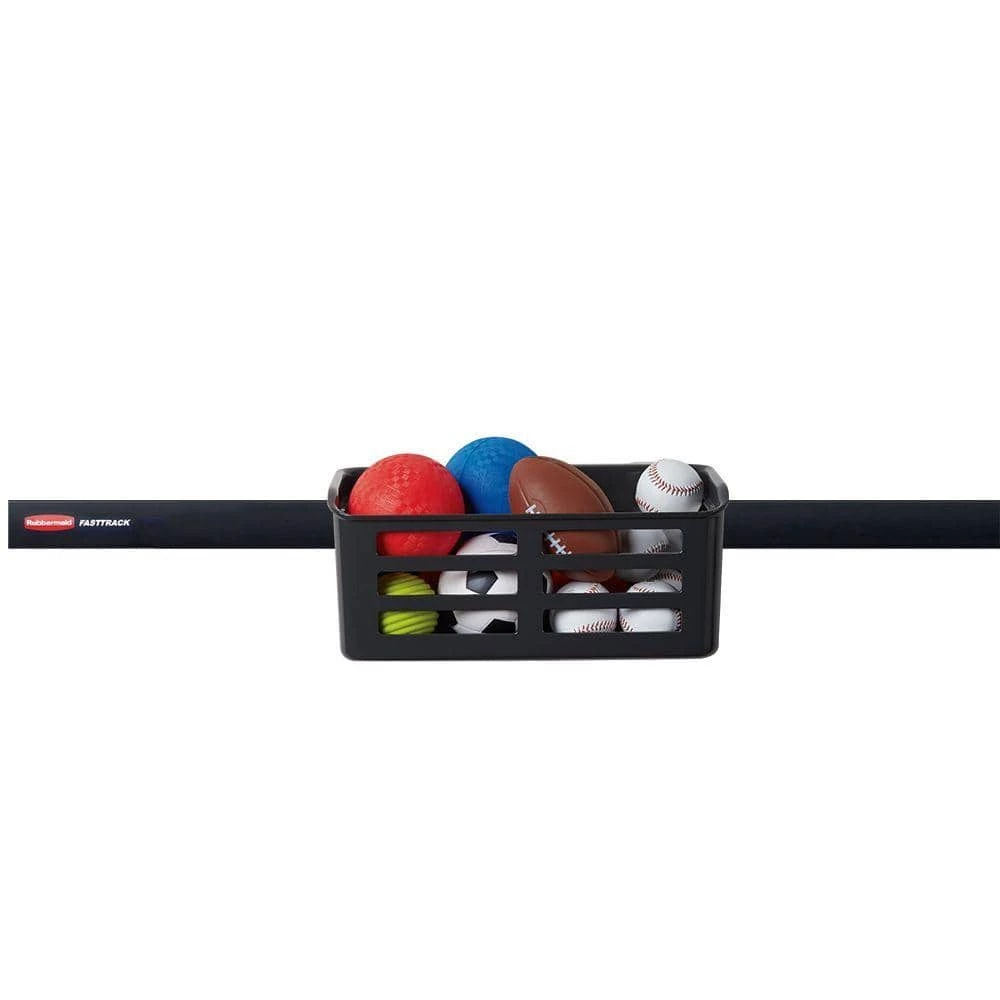 Reclaim your garage space with the Rubbermaid FastTrack Rail Utility Resin Bin. This utility bin helps keep your garage organized and stores items for easy find. Contents are easily identified through the vented side panels, which makes this storage lightweight when using the side handles for transporting the bin. This easy-to-install storage bin holds up to 25 lbs. of sports equipment, gardening supplies and more. It works perfectly with the Rubbermaid FastTrack Rails and Upright organization system (sold separately). Bracket included for easy installation.