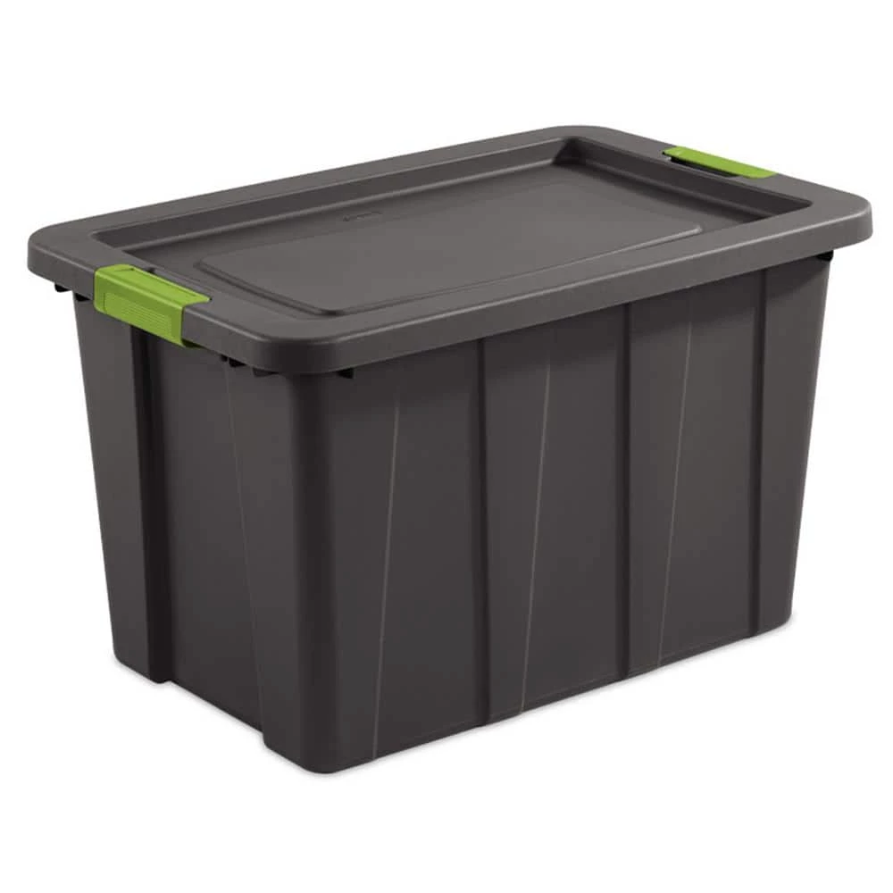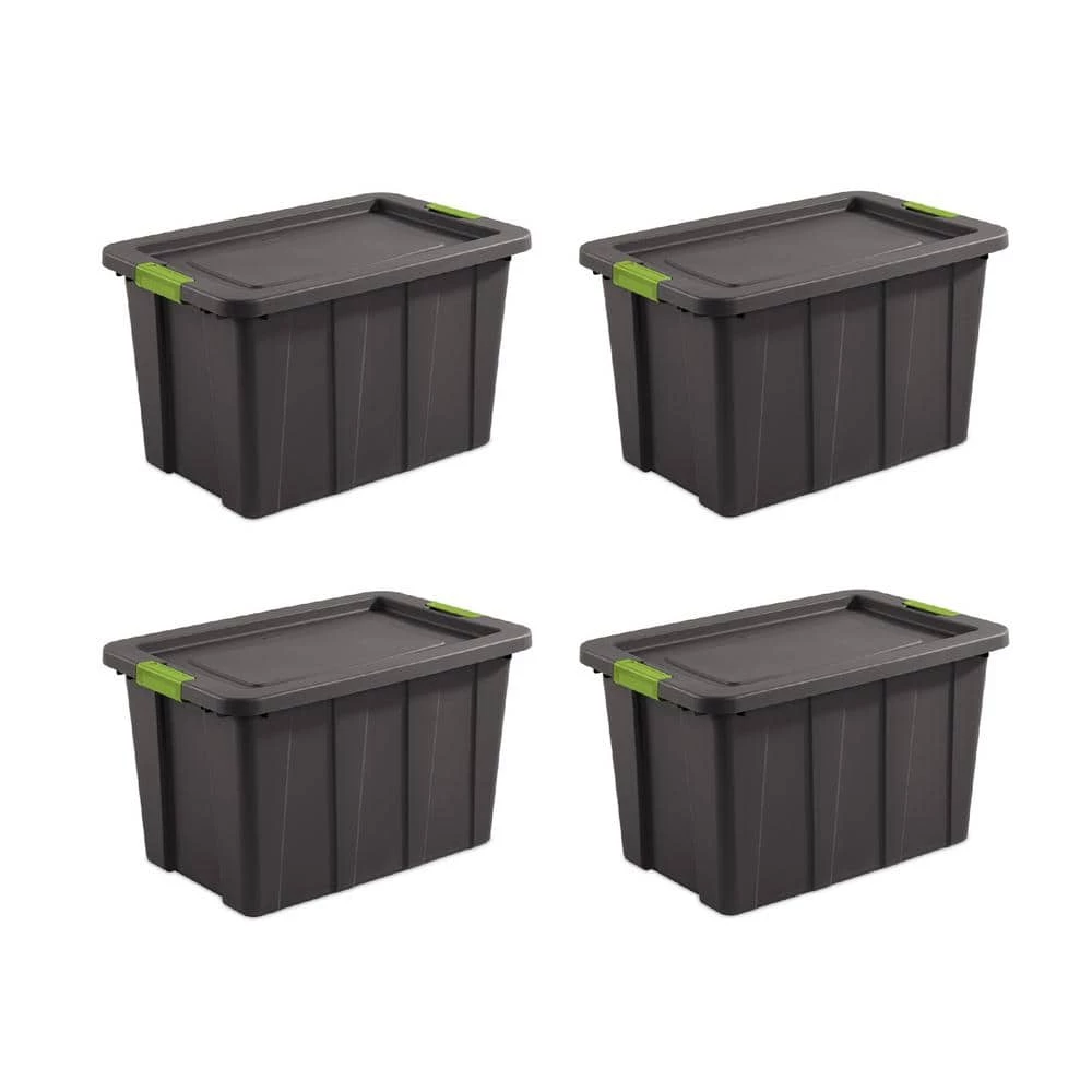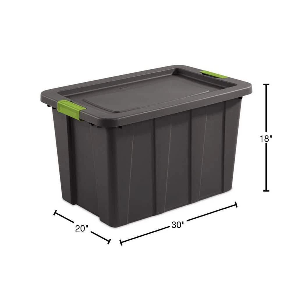 Take advantage of that storage space in basements, garages, or attics with the rugged Sterilite Tuff1 Latching 30 Gal. Storage Tote. These 4 storage bins feature durability and strength for added peace of mind that contents will stay safely stored inside. Comes with 4 boxes that include 4 storage containers in each box. The 30 Gal. storage containers make a great solution for storing away camping supplies, sporting equipment, and seasonal items in more challenging environments. Made from polyethylene plastic, these storage totes are rugged and impact resistant even in colder temperatures, making them ideal for more active storage needs. Contoured end panels and integrated handles make for a comfortable grip when carrying. The latches offer extra security so the lid and your items stay in place. The deep recessed lids allow multiple storage totes to stack securely for efficient use of vertical space. The overall dimensions of each storage container is about 30 in. long, 20 in. wide, and 18 in. tall.