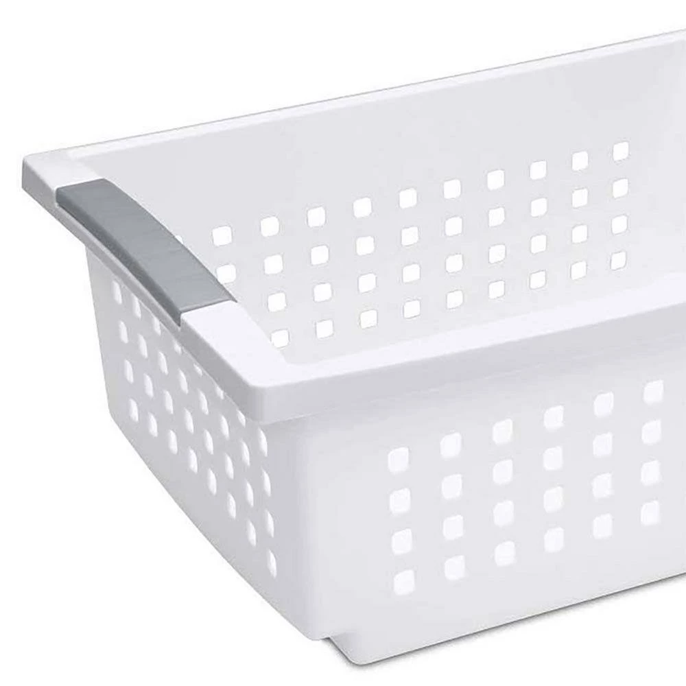 Bring back order to your home and to your life with the Sterilite Medium-Sized Stackable Storage & Organization Basket 20-Pack. The Sterilite Storage Basket is ideal for a wide variety of uses including organizing countertops, kitchen cabinets, pantries, and shelving around the home. Store dry goods in your kitchen pantry, organize supplies in the bathroom or declutter the cleaning supplies under the sink. The contoured handles allow for comfortable transporting, and the smooth finish is easy to clean. Flip down the accent rails to stack several of these indented bins and maximize vertical storage space. These bins are also the perfect size for containing crafting or office supplies. Try integrating the baskets with a bookcase or with opened shelving to tidy up your child’s books, games, or toys. The Sterilite storage bin is great for the garage, crafts, toys, games, and even fresh pantry items too. Anywhere you need to declutter the Sterilite Storage Basket 20-Pack is your solution.